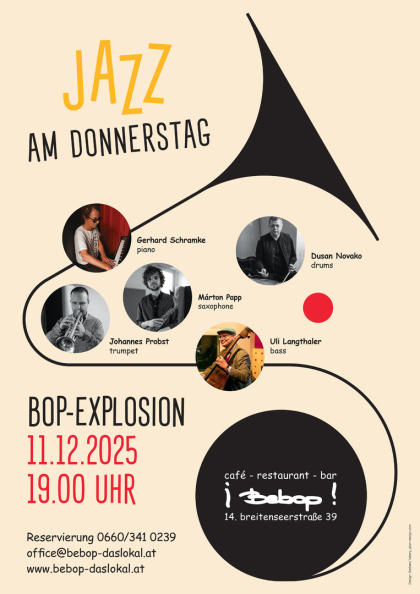 Die Band Bop-Explosion ist wieder einmal ein musikalischer Leckerbissen für alle Jazz-Fans. Das Programm ist sehr vielseitig: Anspruchsvolle Jazz-Standards sind ebenso vertreten wie zahlreiche Kompositionen des Bandleaders Gerhard Schramke. Das Spektrum reicht von Modernjazz sowohl swingend als auch latin über lyrische Balladen und immer mehr auch Titeln in Jazzrock/Funk. Diese Top-Formation der österreichischen Jazzszene hat im vergangenen Jahr das Album „Waltz for Serena“ aufgenommen, und das nächste Album steht kurz vor der Erscheinung am Markt. Deshalb wird natürlich an diesem Abend bereits viel Musik von der neuen Produktion dargeboten werden.